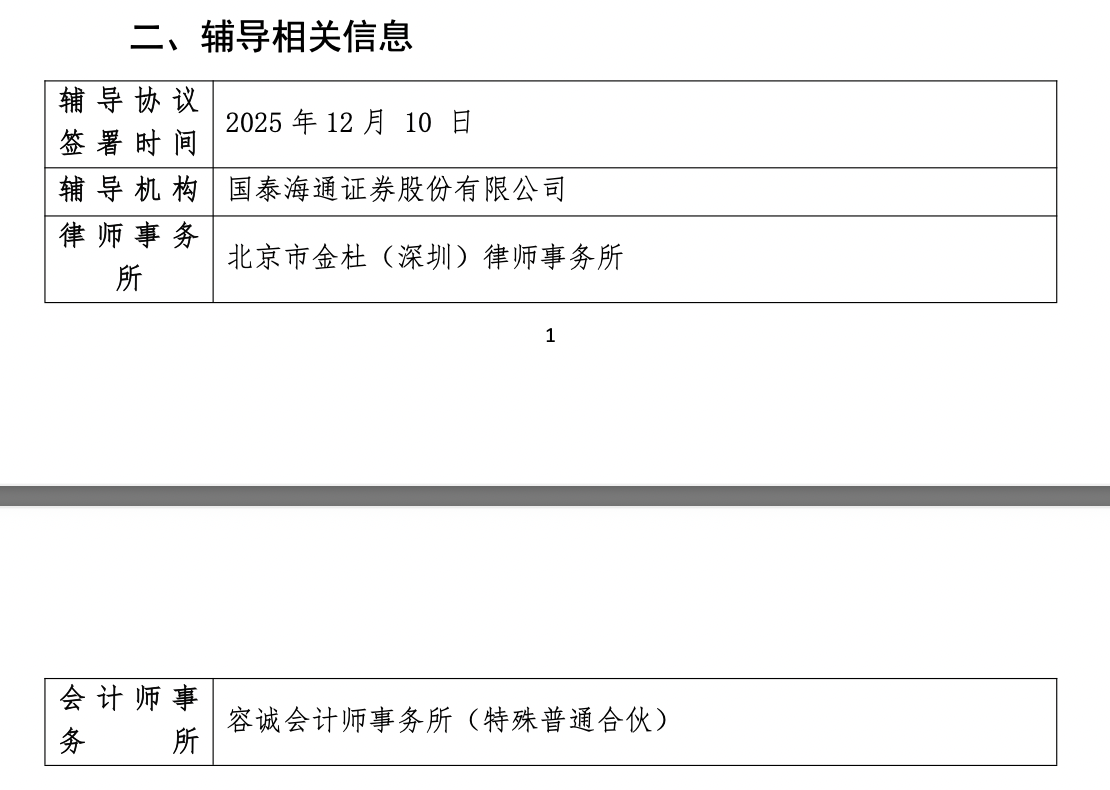 本次IPO的輔導機構為國泰海通證券股份有限公司,律師事務所為北京市金杜(深圳)律師事務所,會計師事務所為容誠會計師事務所(特殊普通合伙)。