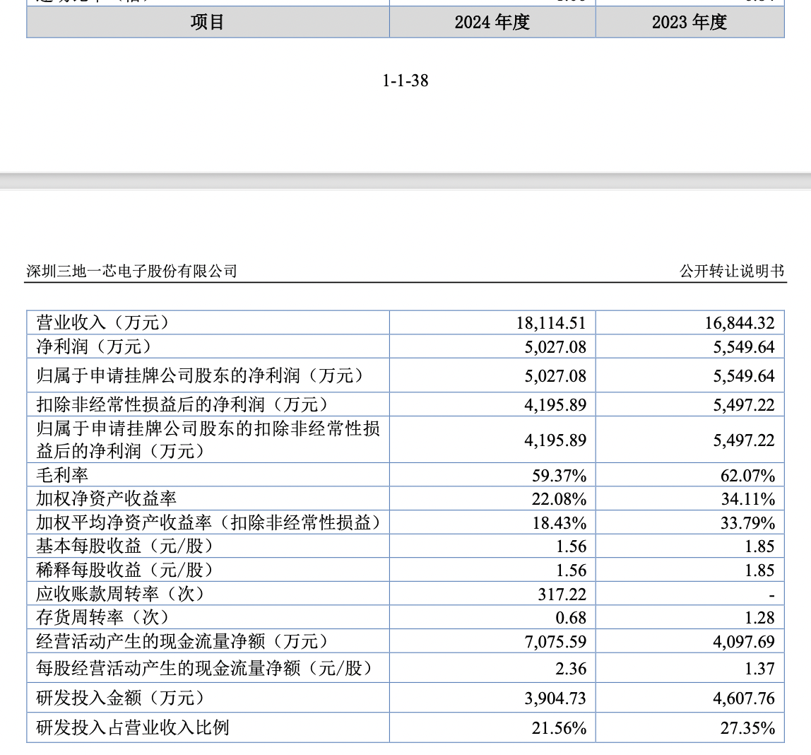 業績方面,2023年-2024年,三地一芯實現營收分別為1.68億元、1.81億元;歸母凈利潤分別為5549.64萬元、5027.08萬元。可見,2024年其增收不增利。