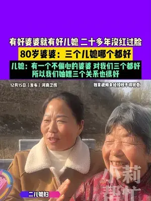 12月15日(發布)河南衛輝,有好婆婆就有好兒媳 二十多年沒紅過臉,80歲婆婆:三個兒媳哪個都好,兒媳:有一個不偏心的婆婆 對我們三個都好,所以我們妯娌三個關系也很好。