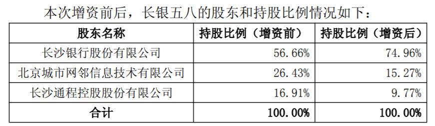 本次增資前后,長沙銀行持股比例由56.66%增至74.96%,北京城市網鄰信息技術有限公司持股比例由26.43%降至15.27%,長沙通程控股股份有限公司持股比例由16.91%降至9.77%。