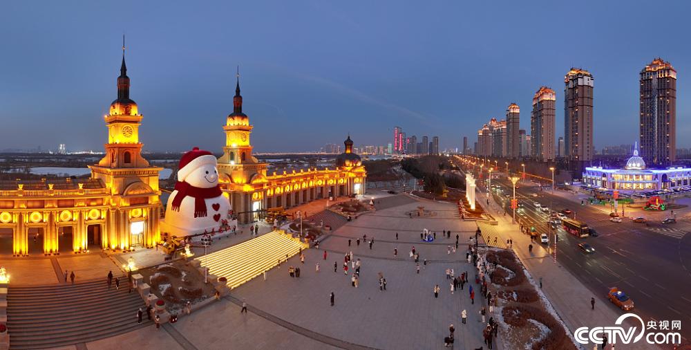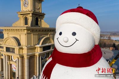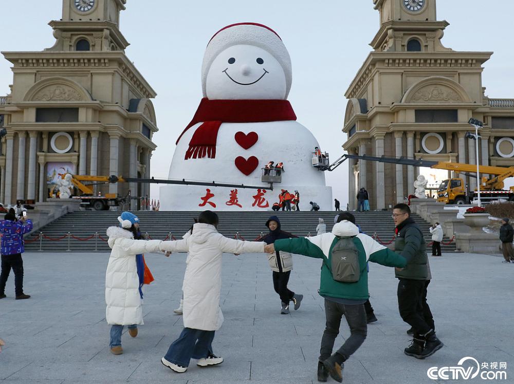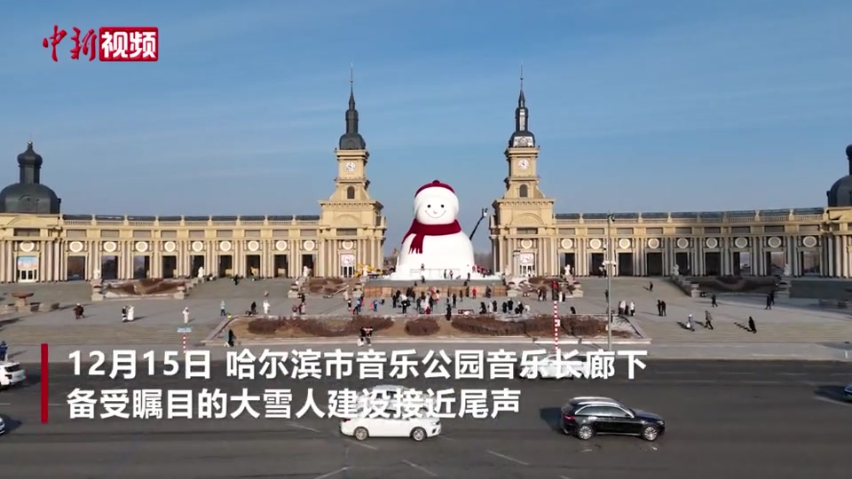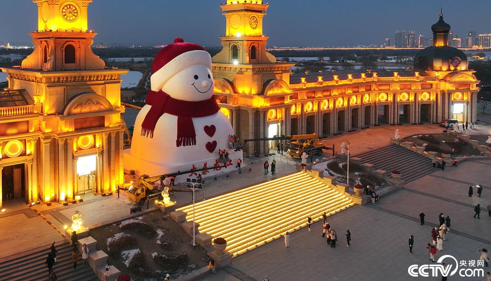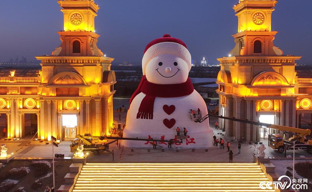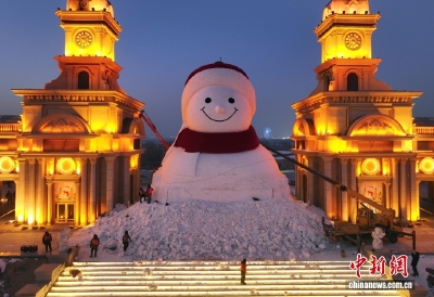 2025年12月15日,黑龍江省哈爾濱市,音樂長廊的“頂流”大雪人,已經基本完工,幾名工人正站在升降機上進行著最后的“精修”。視覺中國