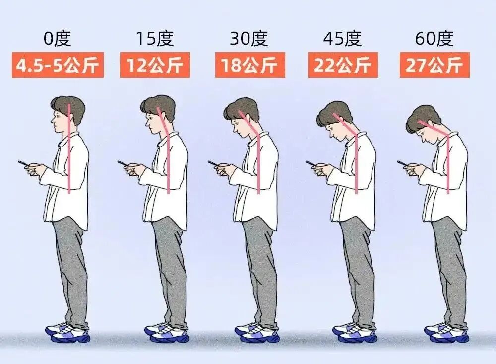 此外,據紐約脊椎手術及康復中心的一份報告稱,低頭玩手機,會讓頸椎承受60磅(約27公斤)的重壓,比一個7歲小孩還重。