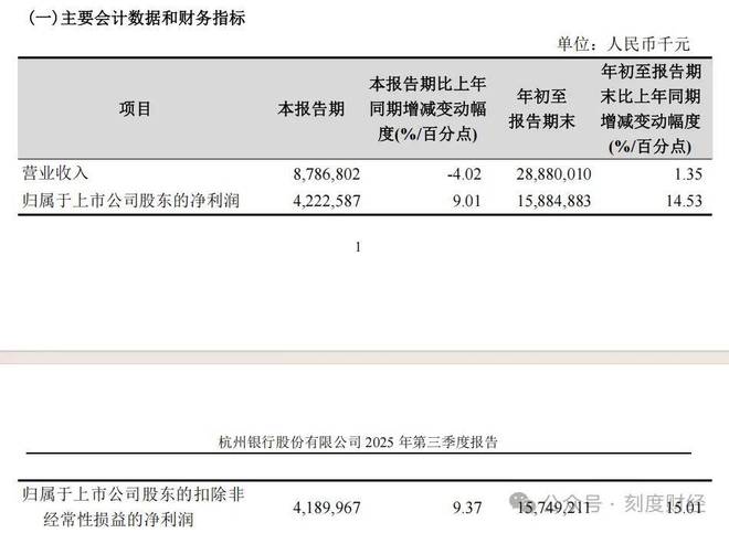 如果說(shuō)人事大變動(dòng)是“隱性風(fēng)險(xiǎn)”,三季度財(cái)報(bào)披露的業(yè)績(jī)數(shù)據(jù)則是“顯性危機(jī)”。數(shù)據(jù)顯示,前三季度杭州銀行實(shí)現(xiàn)營(yíng)收288.80億元,同比僅增1.35%,增速較上半年跳水。其中第三季度單季營(yíng)收87.87億元,同比下滑4.02%,創(chuàng)下上市以來(lái)首次單季營(yíng)收負(fù)增長(zhǎng)紀(jì)錄。