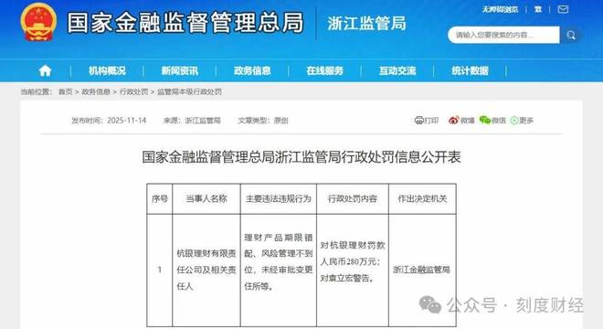 2025年11月,杭州銀行旗下理財(cái)子公司杭銀理財(cái)收到280萬(wàn)元罰單,這是其成立以來(lái)最大單筆罰款,涉及理財(cái)產(chǎn)品期限錯(cuò)配、投資決策風(fēng)控不力、信息披露不充分等多項(xiàng)違規(guī)。值得注意的是,這已是杭銀理財(cái)3年內(nèi)第3次被罰,累計(jì)罰款達(dá)385萬(wàn)元。