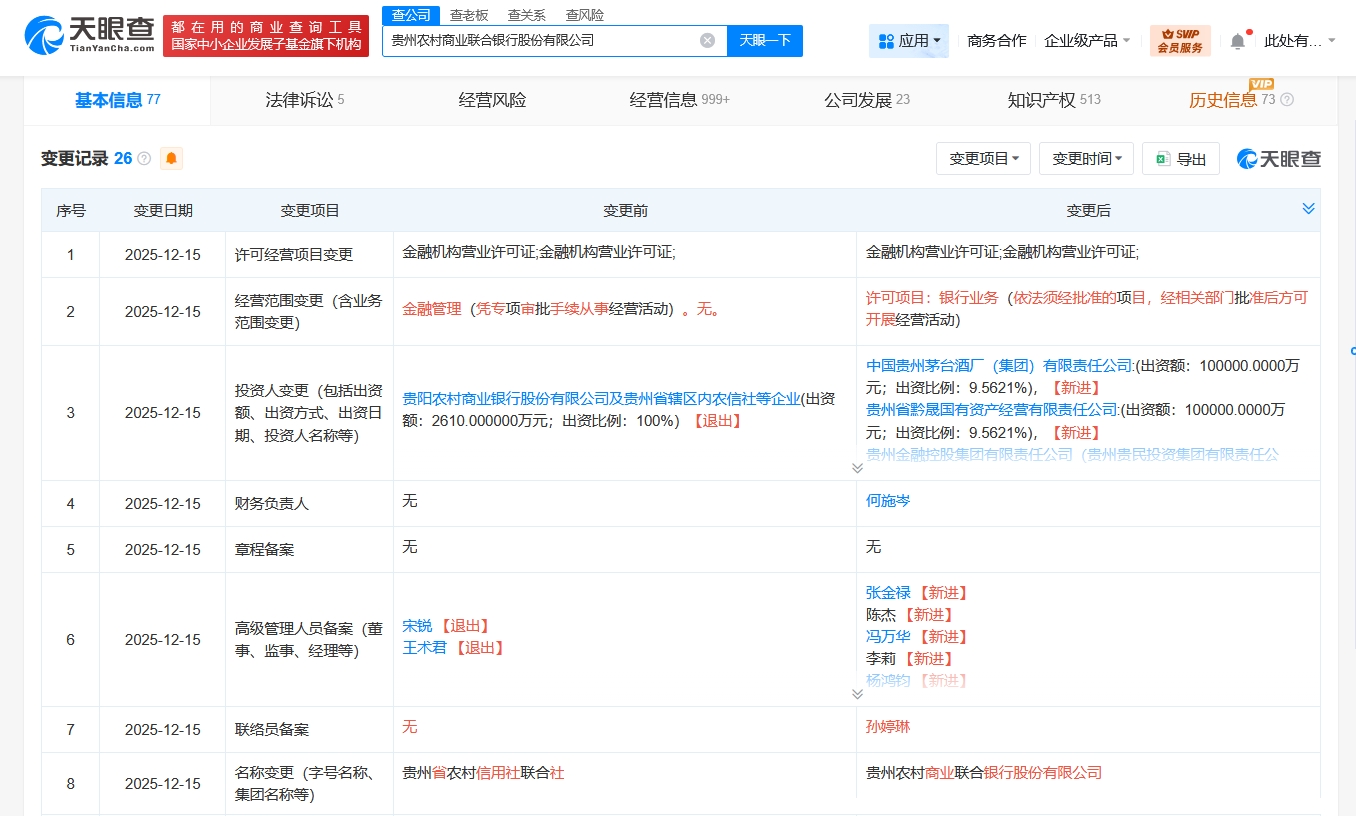 天眼查工商信息顯示,近日,貴州省農村信用社聯合社發生工商變更,企業名稱變更為貴州農村商業聯合銀行股份有限公司,新增貴州金融控股集團有限責任公司(貴州貴民投資集團有限責任公司)、貴州省財政廳、貴州省黔晟國有資產經營有限責任公司、中國貴州茅臺酒…