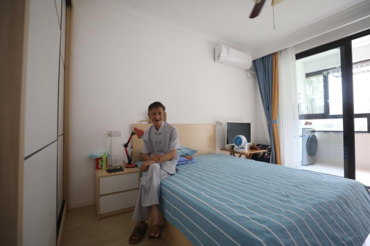 彭三小區五期居民陸老伯坐在新房床邊,他的住房由改造前的7平方米增加到28平方米,陸老伯很高興(2022年7月21日攝)。新華社記者方喆攝