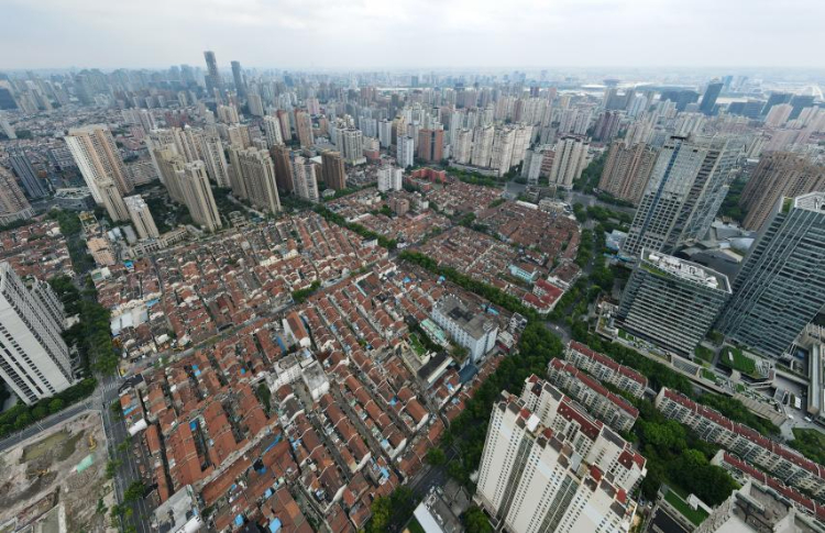 空中俯瞰上海市黃浦區建國東路68街坊和67街坊東塊所在區域(無人機照片,2022年7月21日攝)。7月24日凌晨,上海市黃浦區建國東路68街坊和67街坊東塊的房屋征收簽約率突破90%。新華社記者方喆攝