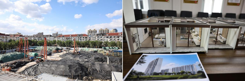 拼版照片:左圖為正在進行拆除重建改造的黃興路1039弄小區,目前樁基施工已完成(2025年10月23日攝);右圖為黃興路1039弄小區改造項目部拍攝的小區改造效果圖和房型模型(2025年10月23日攝)。新華社記者方喆攝