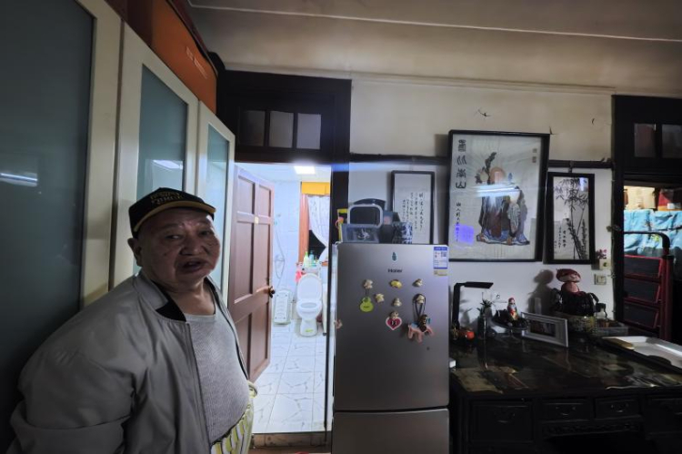 愚園路1407弄小區居民李老伯站在自家改造完成的獨用衛生間門口。愚園路1407弄延陵邨小區是無法大拆大建的風貌保護街區。通過抽戶改造方式解決“拎馬桶”難題(2025年10月23日攝)。新華社記者方喆攝