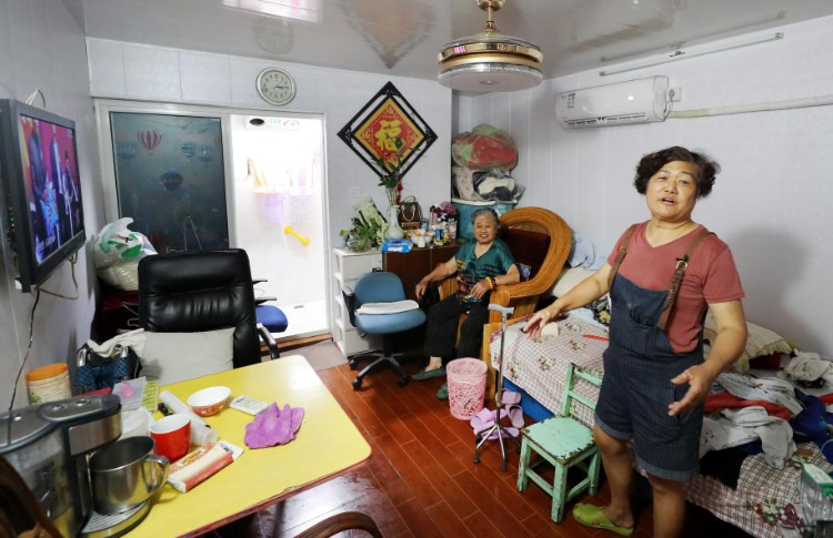 寶昌路731弄居民李才英(右)和她92歲的母親在家中看電視,左前側是她家完成改造的新衛生間,不用再為“拎馬桶”煩惱(2019年7月18日攝)。新華社記者方喆攝