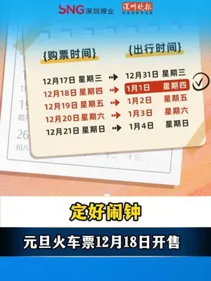 2026年元旦3天假,火車票即將開售 2026年元旦3天假,火車票即將開售 購票日歷請查收!溫馨提醒:訂好鬧鐘,別讓快樂錯過站!#元旦 #假期 #火車票 #開售 #2026 (來源:大象新聞)