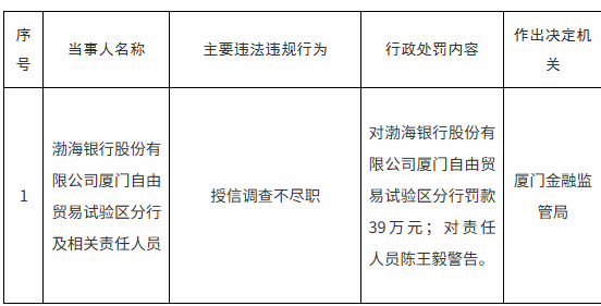 【大河財立方消息】近日,國家金融監督管理總局廈門監管局披露的行政處罰信息公開表顯示,渤海銀行股份有限公司廈門自由貿易試驗區分行因授信調查不盡職,被廈門金融監管局罰款39萬元,對責任人員陳王毅予以警告。