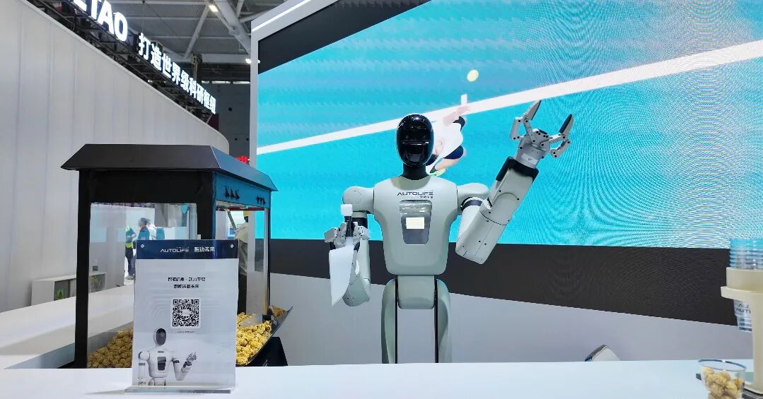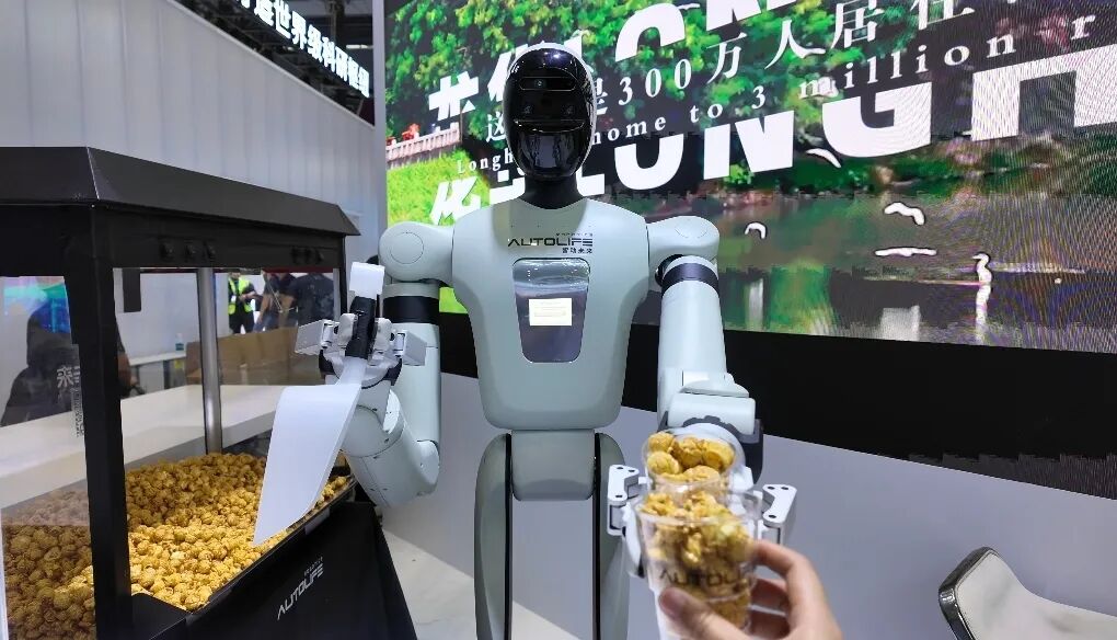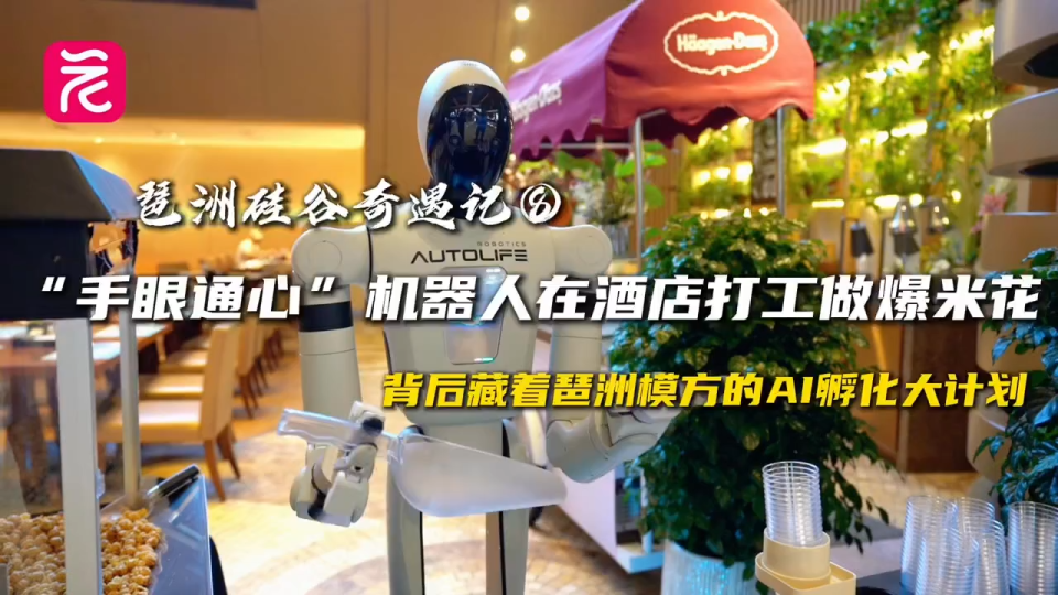 S2智能人形機器人在這里展示了鏟爆米花、裝杯、遞送等一系列動作,物品抓取擺放成功率高達99%,并能淡定應對客人突然移開杯子等突發狀況。