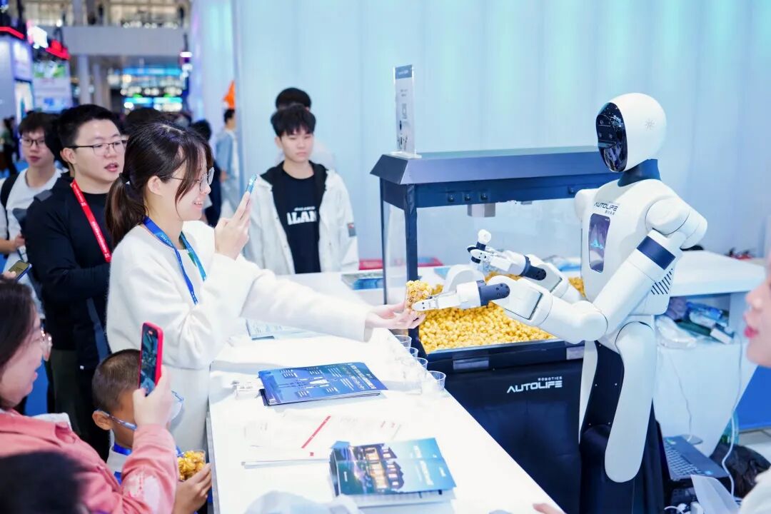第二代產品“小智”智能人形機器人在現場再次演示了操作爆米花機等復雜任務,展現了強大的負載和視覺識別抓取能力。