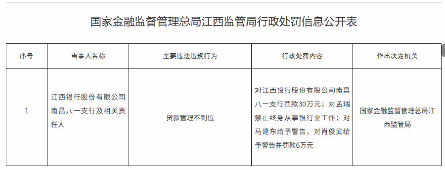 【大河財立方消息】近日,國家金融監督管理總局江西監管局行政處罰信息公開表顯示,江西銀行股份有限公司南昌八一支行因貸款管理不到位被罰款30萬元。同時,孟瑞因貸款管理不到位,被禁止終身從事銀行業工作;馬建東因貸款管理不到位,被給予警告;肖俊武因貸款管理不到位,被給予警告并罰款6萬元。