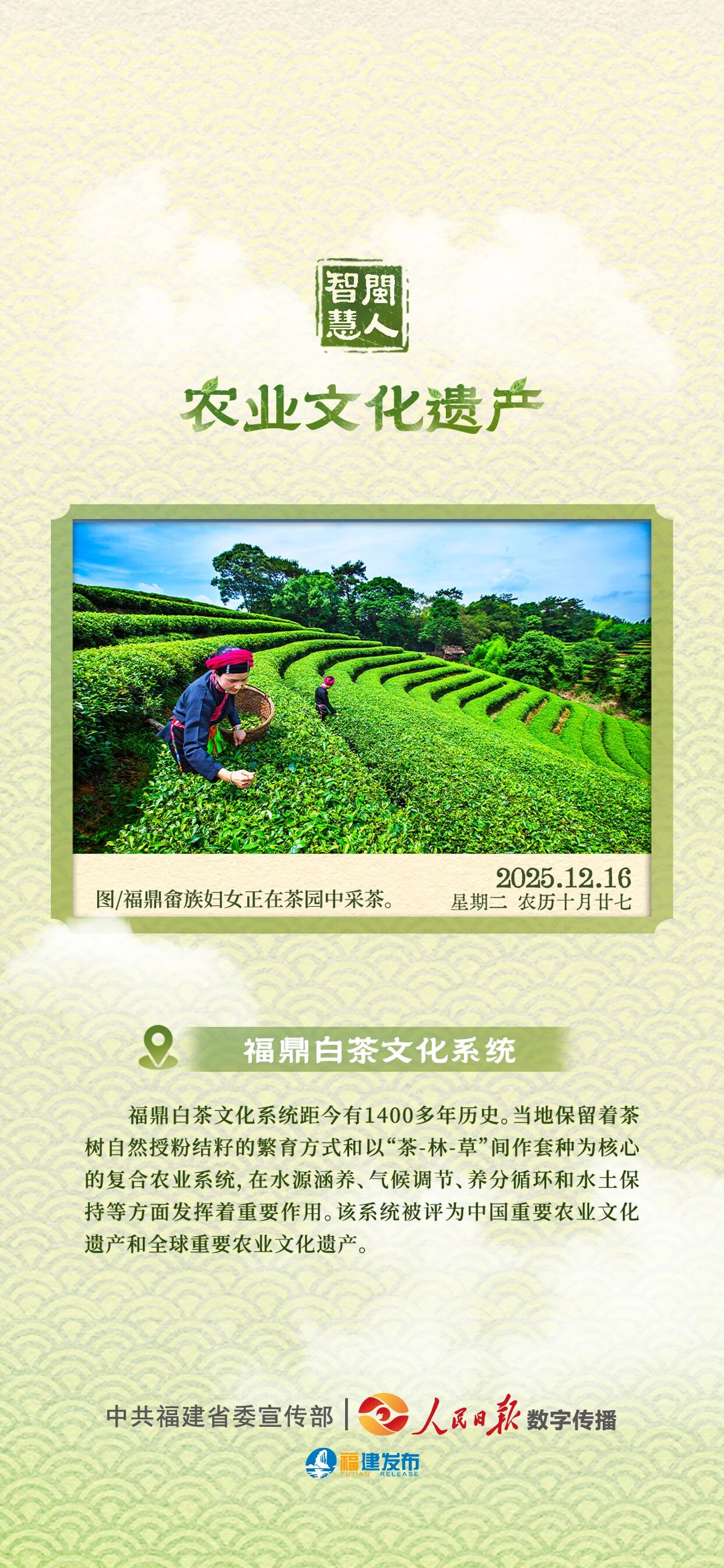 福鼎白茶文化系統距今有1400多年歷史。當地保留著茶樹自然授粉結籽的繁育方式和以“茶-林-草”間作套種為核心的復合農業系統,在水源涵養、氣候調節、養分循環和水土保持等方面發揮著重要作用。該系統被評為中國重要農業文化遺產和全球重要農業文化遺產。