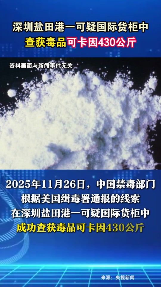 記者12月16日從公安部獲悉,11月26日,中國禁毒部門根據美國緝毒署通報的線索,在深圳鹽田港一可疑國際貨柜中,成功查獲毒品可卡因430公斤。目前該案正在進一步偵辦中。