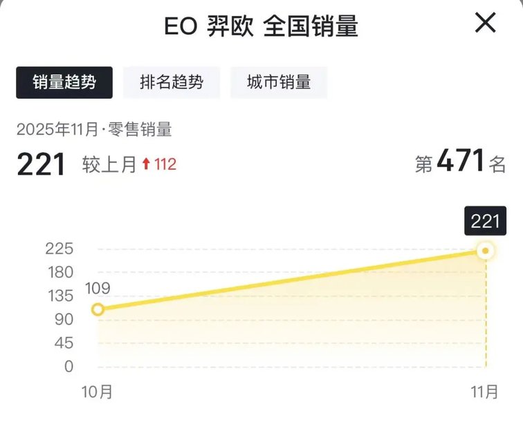第三方平臺數據顯示,EO 羿歐上市后首個完整銷售月(2025 年 11 月)的零售量僅為 221 輛。這一成績與同價位自主品牌車型動輒月銷過萬的表現形成刺眼對比,更與北京現代的戰略期待相去甚遠。
