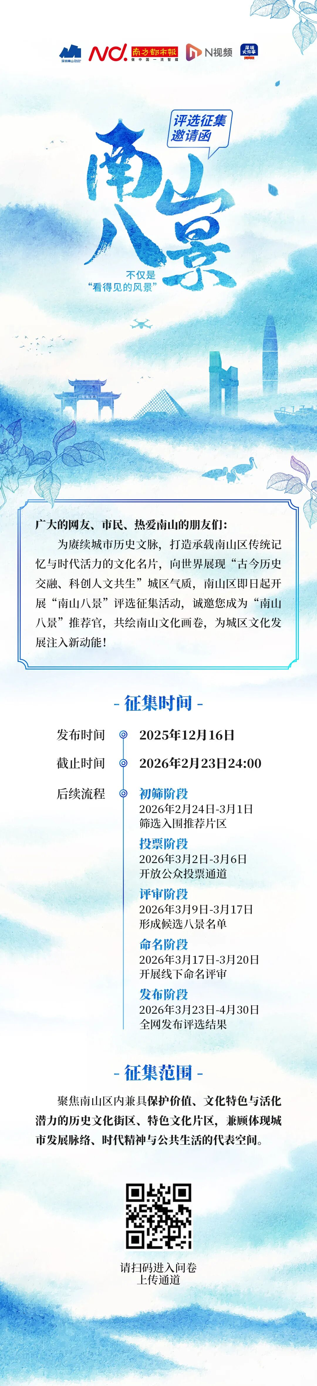 此次“南山八景”的評選范圍超廣——歷史文化街區、生態地標、科創空間、公共生活場景全都算,“人文之韻、生態之美、煥活之興、公眾之選”是評選的四大維度。