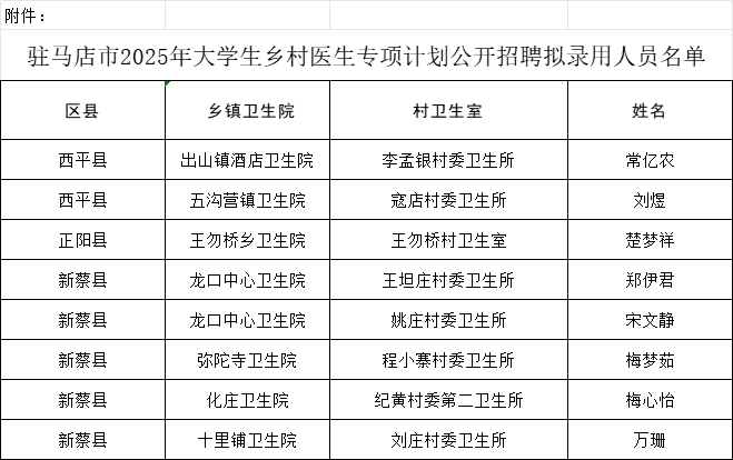 附件:駐馬店市2025年大學生鄉村醫生專項計劃公開招聘擬錄用人員名單