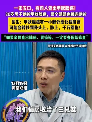 12月19日河南鄭州,一家五口,有四人查出甲狀腺癌!30歲男子確診甲狀腺癌,兩個(gè)姐姐也接連確診,醫(yī)生:甲狀腺癌有一小部分惡化程度高,可能會(huì)轉(zhuǎn)移到骨頭上、肺上,千萬(wàn)別拖!“如果親屬查出肺癌、胃癌等,一定要去醫(yī)院篩查”
