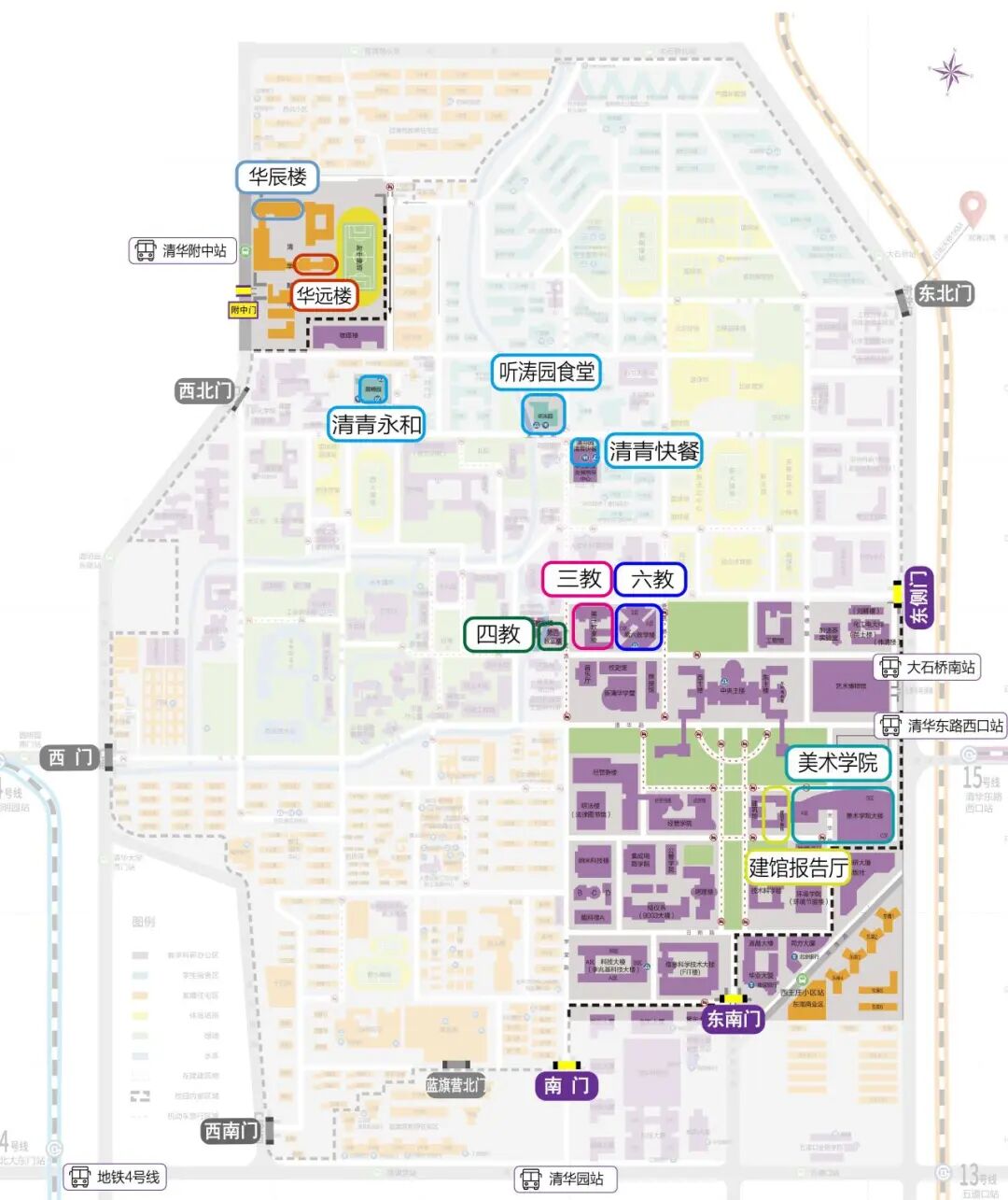 ①考試地點在清華大學校內四教、六教、美術學院的考生:學校的各個門均可入校和出校,其中東南門、東側門和南門距離考場相對較近(步行約20分鐘)。清華大學東南門臨近雙清路和華業大廈,東側門臨近荷清路和清華大學藝術博物館,南門臨近中關村東路和文津酒店。