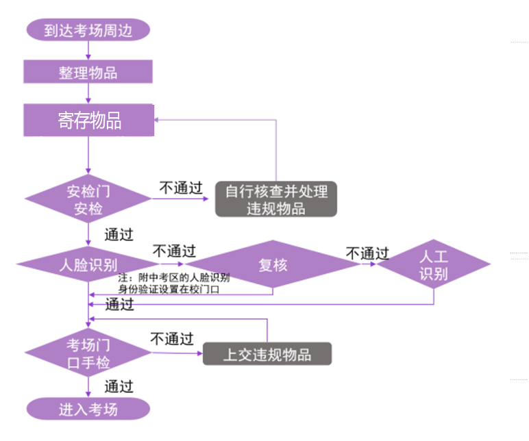 按照要求今年研考入場安檢實行智能安檢、人臉識別、金屬探測等核查方式,考生入校后須提前在考場安檢區外的存包處存放個人物品。考慮到存包及入場查驗需要、考生入校后距離考場樓較遠,請考生預留充足時間。入校后只能步行或騎車,請根據現場工作人員的指揮停放自行車。