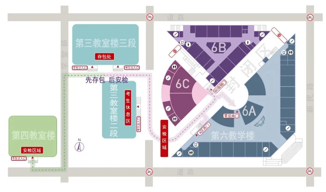 圖4 四教、六教的存包處、安檢通道和考場樓入口示意圖
