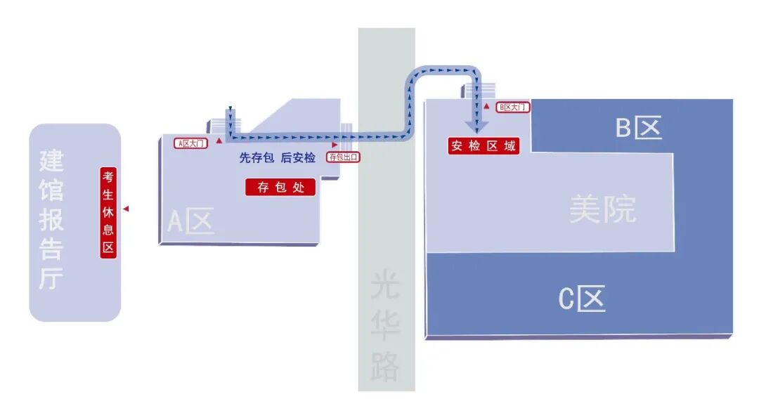 圖5 美術學院的存包處、安檢通道和考場樓入口示意圖