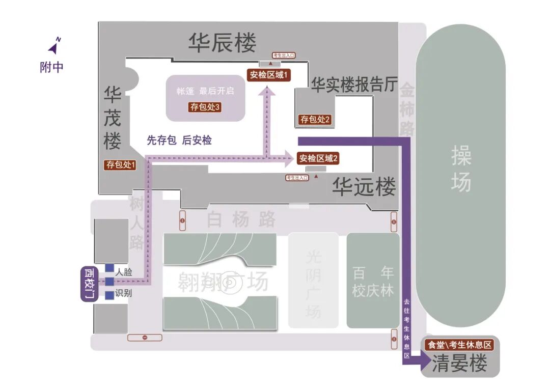 圖6 清華附中的存包處、安檢通道和考場樓入口示意圖