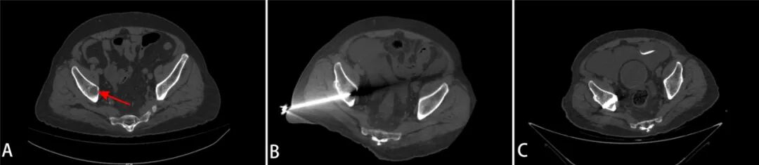 術(shù)前髖臼破壞(A),消融針經(jīng)通道置入病灶(B),骨水泥注入骨質(zhì)缺損處(C)
