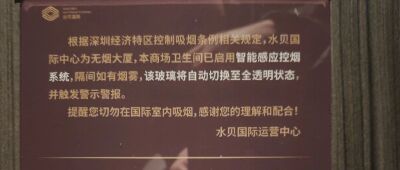 商場公告說明,此處已啟用智能感應控煙系統,如果檢測到煙霧,隔間玻璃便會自動轉為全透明狀態,同時觸發警報警示。