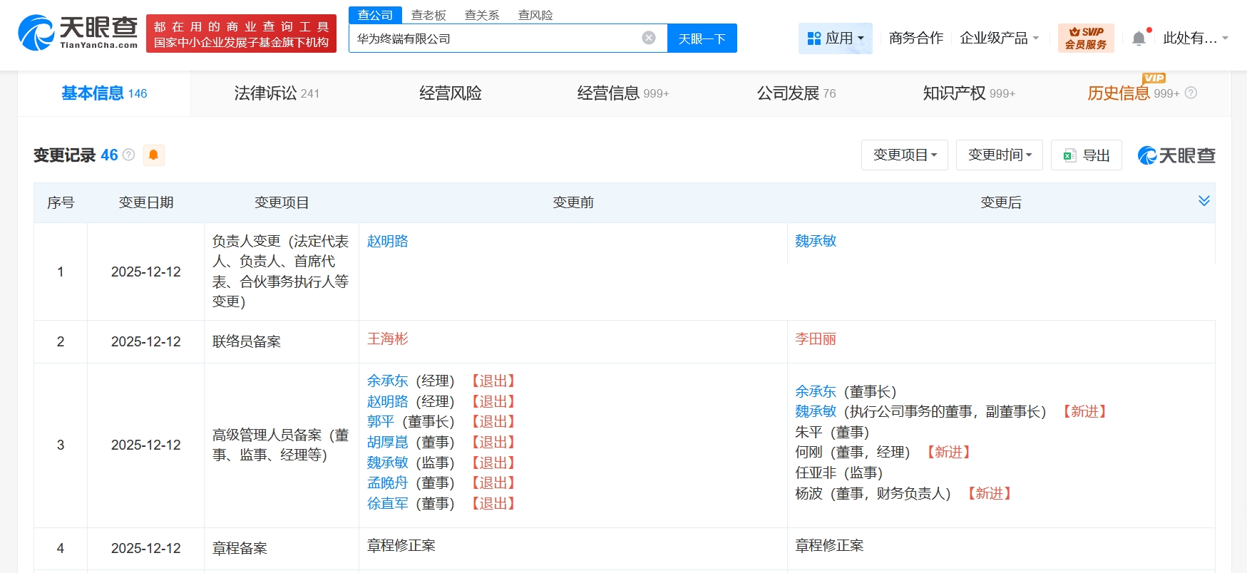 雷達財經訊,天眼查工商信息顯示,近日,華為終端有限公司發生工商變更,郭平卸任董事長,由余承東接任,孟晚舟、徐直軍等卸任董事,同時,多位高管發生變更。