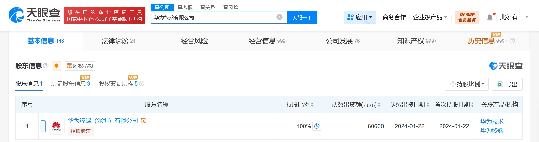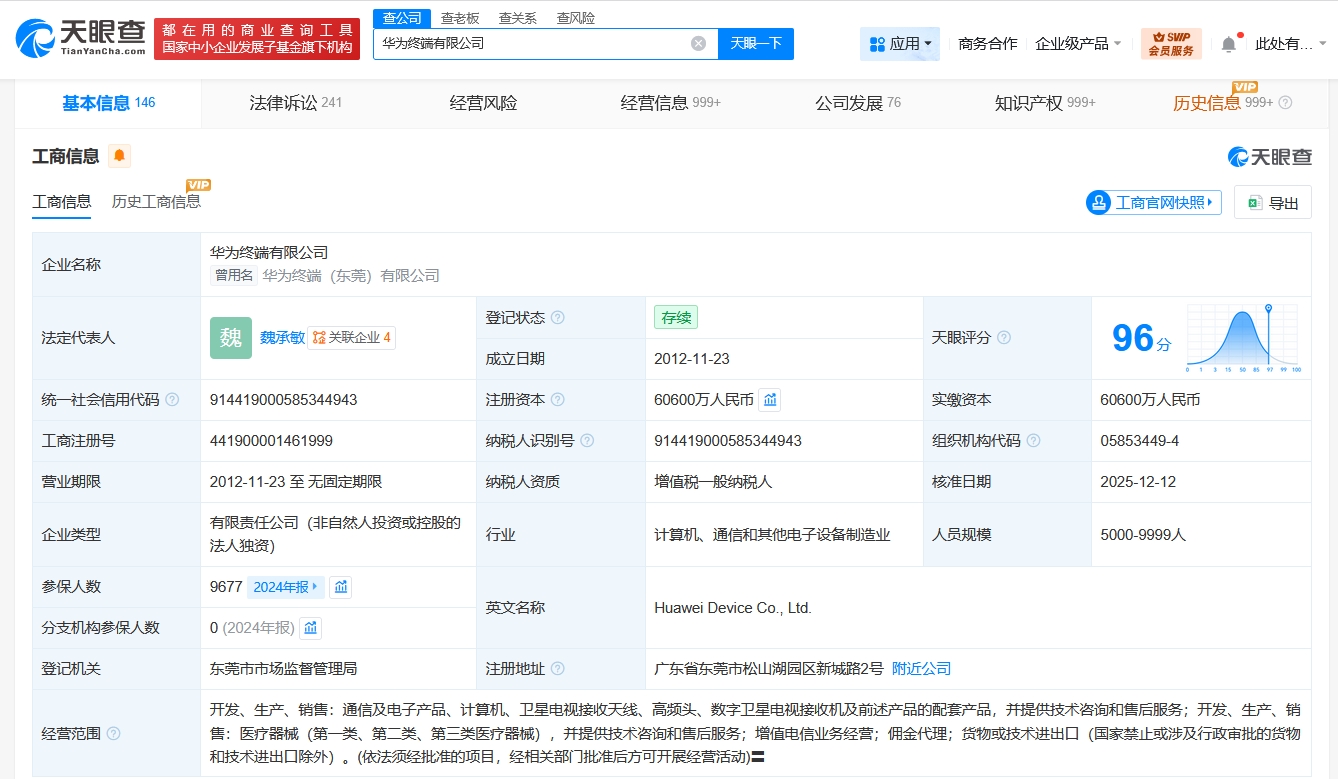 華為終端有限公司成立于2012年11月,法定代表人為魏承敏,注冊資本6.06億人民幣,經營范圍含開發、生產、銷售通信及電子產品、計算機、衛星電視接收天線、高頻頭、數字衛星電視接收機及前述產品的配套產品,并提供技術咨詢和售后服務等。股東信息顯示,該公司由華為終端(深圳)有限公司全資持股。
