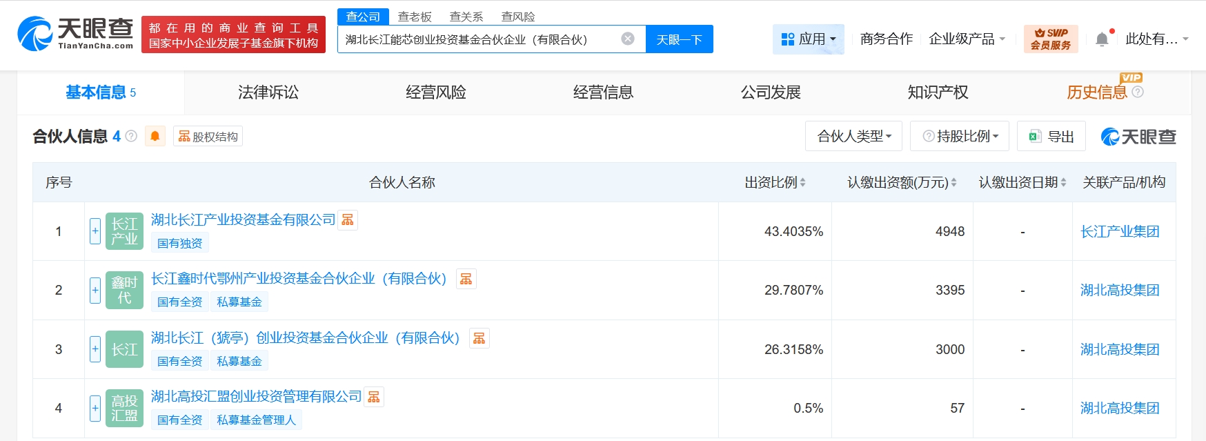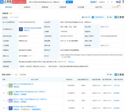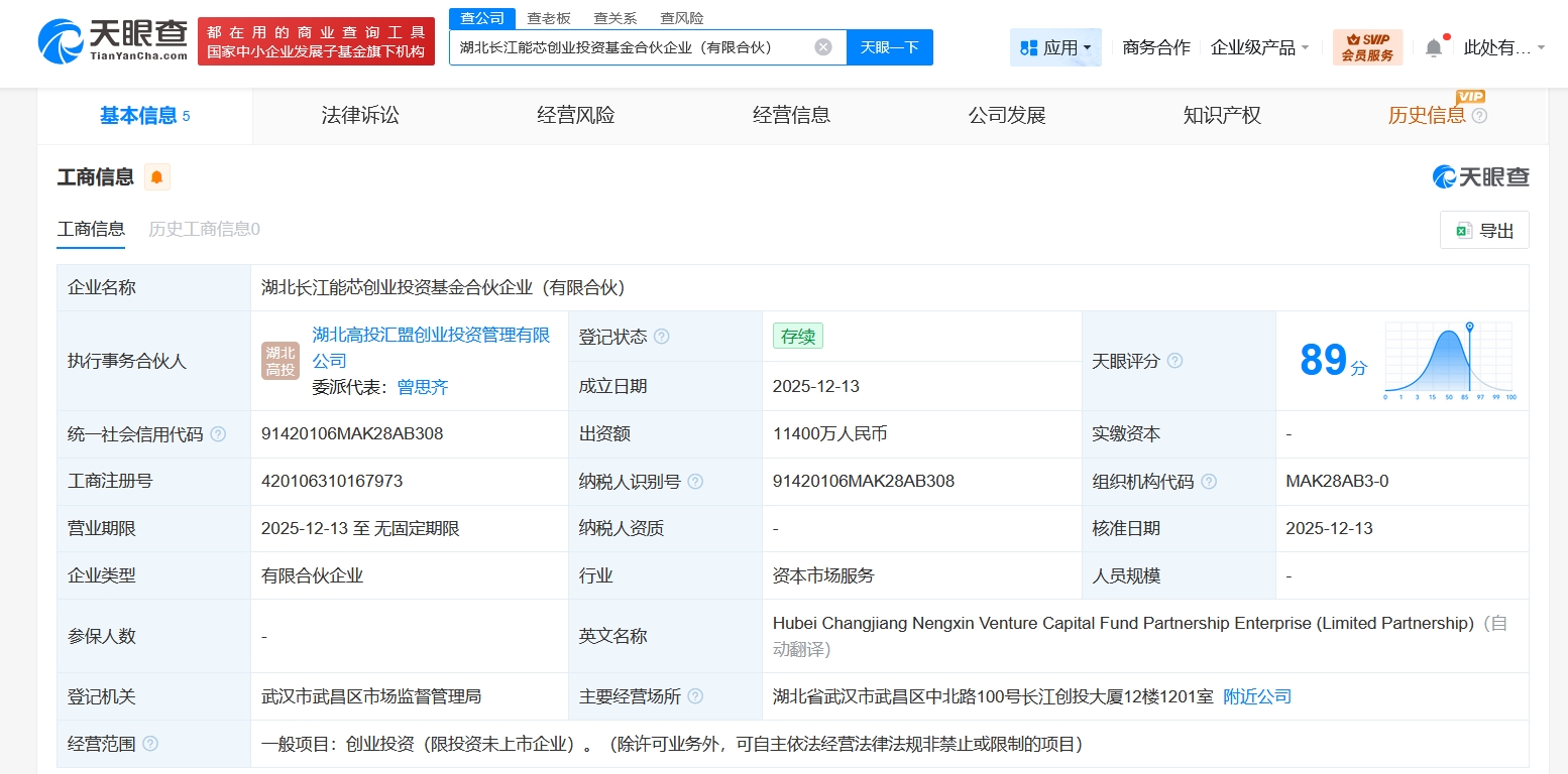 天眼查App顯示,近日,湖北長江能芯創業投資基金合伙企業(有限合伙)成立,執行事務合伙人為湖北高投匯盟創業投資管理有限公司,出資額1.14億人民幣,經營范圍為創業投資。合伙人信息顯示,該基金由湖北長江產業投資基金有限公司、長江鑫時代鄂州產業…