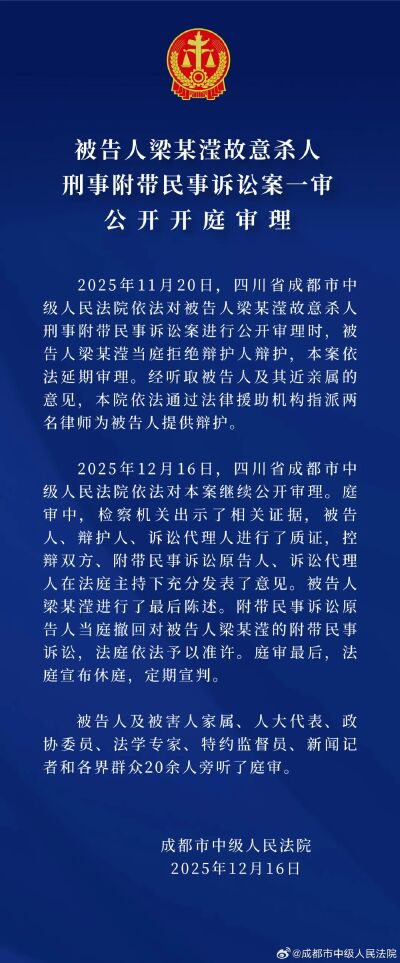 該案上次開庭是在11月20日,庭審從當天上午9點30分持續至當晚8點左右,隨后法庭宣布休庭,被害人母親告訴都市現場記者,休庭原因為被告人梁某某在法庭上突然解除了自己的辯護律師委托。成都市中級人民法院也在20日發布該案一審延期開庭審理公告,稱梁某某當庭拒絕辯護人辯護。