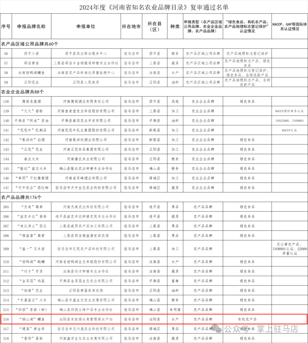 根據《河南省知名農業品牌管理暫行辦法》(豫農市場〔2018〕14號)和年度工作安排,組織開展了2024年度《河南省知名農業品牌目錄》(以下簡稱目錄)評選審訂工作,經自愿申報、逐級推薦、專家評審、社會公示等程序,確定“鞏義小相菊花”等298個品牌入選《目錄》;“黃河大鯉魚”等324個入選《目錄》滿5年的品牌復審通過,現予公示。