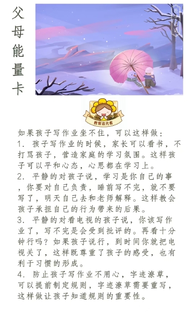 有沒有更好的辦法讓家長告別焦慮、抓狂、暴躁,讓孩子舒心地完成家庭作業?在我看來,家長就承擔家長該承擔的,學會放手。要和孩子約法三章,告訴孩子做作業是他(她)的事,不是父母的事。父母簽字可以,但不承擔檢查的任務。從孩子入讀小學一年級開始,就要把這樣的觀念告訴孩子,讓孩子從小養成良好的習慣。遇到需要聽寫、背誦等類型的作業,可以讓孩子借助多媒體自行完成。譬如聽寫生字詞語,讓孩子利用手機錄音軟件,自己先把詞語讀一遍,用錄音功能錄制好,然后一邊播放,一邊聽寫。孩子寫作業時,家長靠得越近,孩子的問題越多。許多孩子沒有養成良好的家庭作業習慣,多數都是家長“過度干預”造成的。坐孩子桌邊,陪孩子寫作業,家長往往會養成嘮叨、反復干預的壞毛病。而這種壞毛病,自己有時還意識不到。想要相安無事,最好的辦法是孩子做作業時離得遠遠的。
