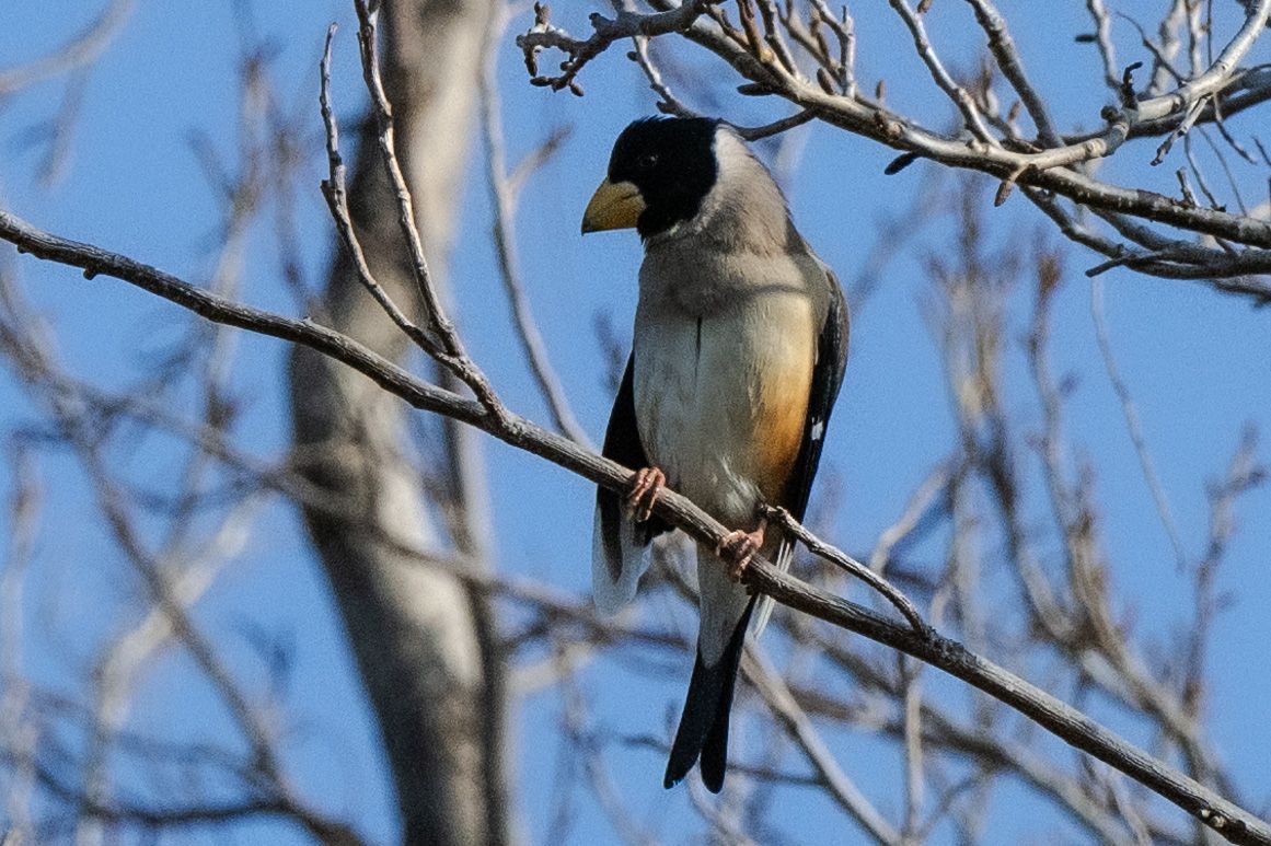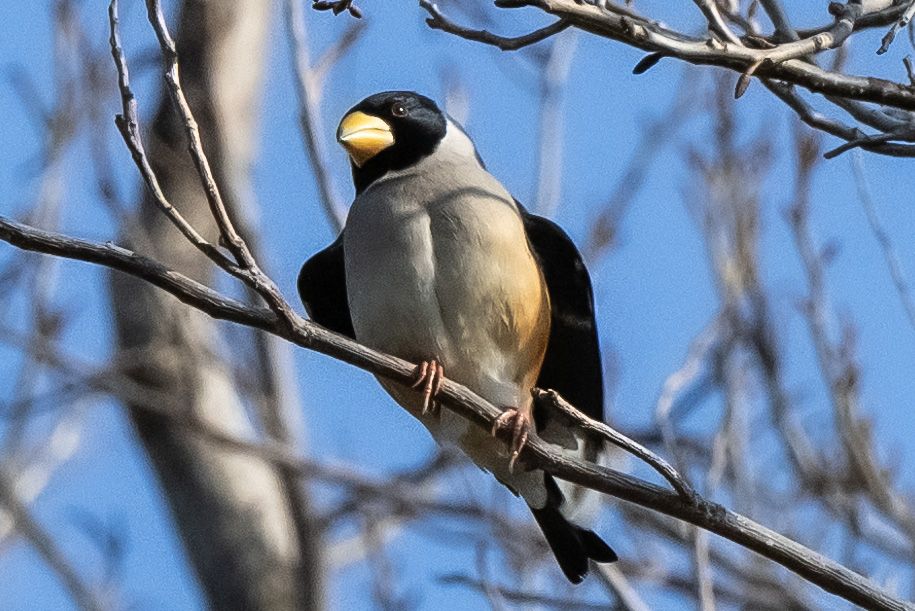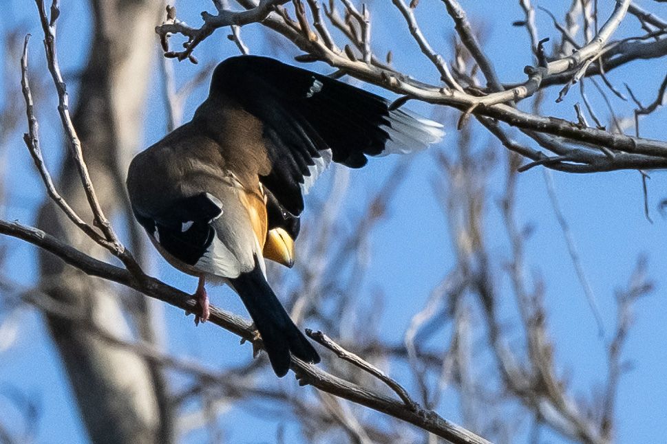 入冬后,它們從東北、華北繁殖地南下,在龍湖這類“掛果豐富”的龍湖國家濕地公園落腳。清晨或午后暖陽時,十幾只甚至數十只黑尾蠟嘴雀會占據一棵海棠或元寶槭的高枝,先大聲“嘎—嘎—”聯絡,然后埋頭啃果,嗑籽聲“嗶嗶啵啵”如雨點落在落葉上,隔著十幾米都能聽見。吃飽后,它們會鉆進附近的針闊混交林或河岸灌叢集體休整;遇到晴暖午后,雄鳥還會站在樹頂亮喉高歌——清脆的“dzi-dzi-dzi”帶著金屬回響,為冬日的龍湖添上一抹靈動。