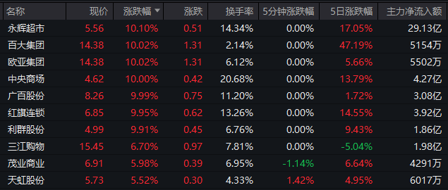 零售概念板塊內,永輝超市、歐亞集團、百大集團、中央商場、廣百股份、紅旗連鎖、利群股份漲停,茂業商業、三江購物、東百集團等個股漲幅居前。消息面上,國家發展改革委發文表示,堅定實施擴大內需戰略。文章表示,要大力提升居民消費意愿,深入實施提振消費專項行動。