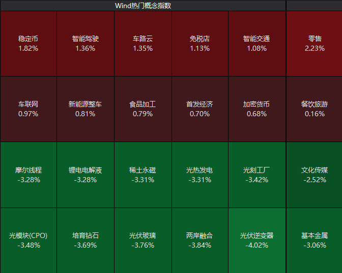 板塊方面,穩定幣、免稅店、車路云、智能駕駛、食品加工、乳業等概念漲幅居前;光伏逆變器、光伏玻璃、培育鉆石、光刻工廠、商業航天、光模塊、工業金屬等概念跌幅居前。
