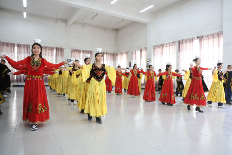 12月9日課間,八年級三班教室內,學生們頭頂瓷碗、手執餐盤,隨著明快的音樂與清脆的盤擊節拍,從容起舞。在身體旋轉、頸部扭動間,碗始終穩穩立于頭頂,動作整齊而靈動,盡顯技藝之美。學生艾克達·塔依爾表示:“跳頂碗盤子舞特別有意思,讓我們放松心情。”