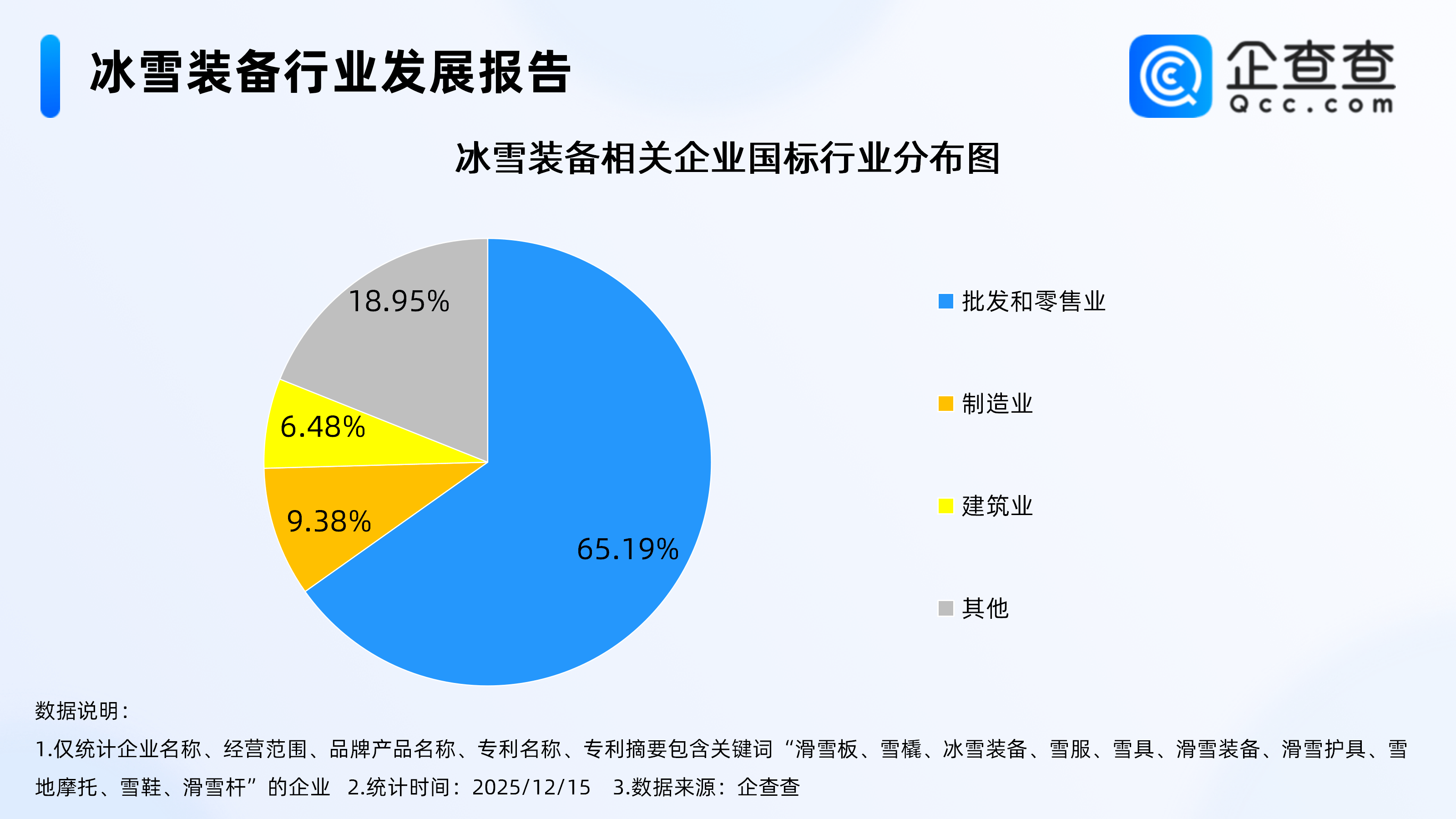企查查數據顯示,從國標行業歸屬分布來看,冰雪裝備相關企業多歸屬于批發和零售業,占比65.19%。其次,歸屬于制造業、建筑業的冰雪裝備相關企業分別占比9.38%、6.48%。
