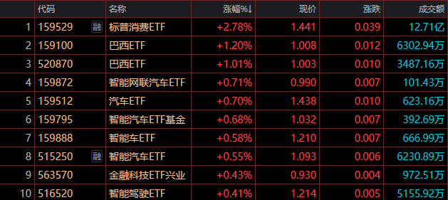 ETF午間收盤漲跌不一,標普消費ETF(159529)領漲2.78%,巴西ETF(159100)漲1.20%,巴西ETF(520870)漲1.01%。