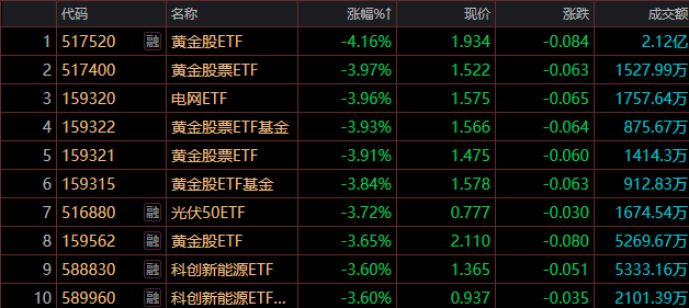 黃金股ETF(517520)領跌4.16%,黃金股票ETF(517400)跌3.97%,電網ETF(159320)跌3.96%。