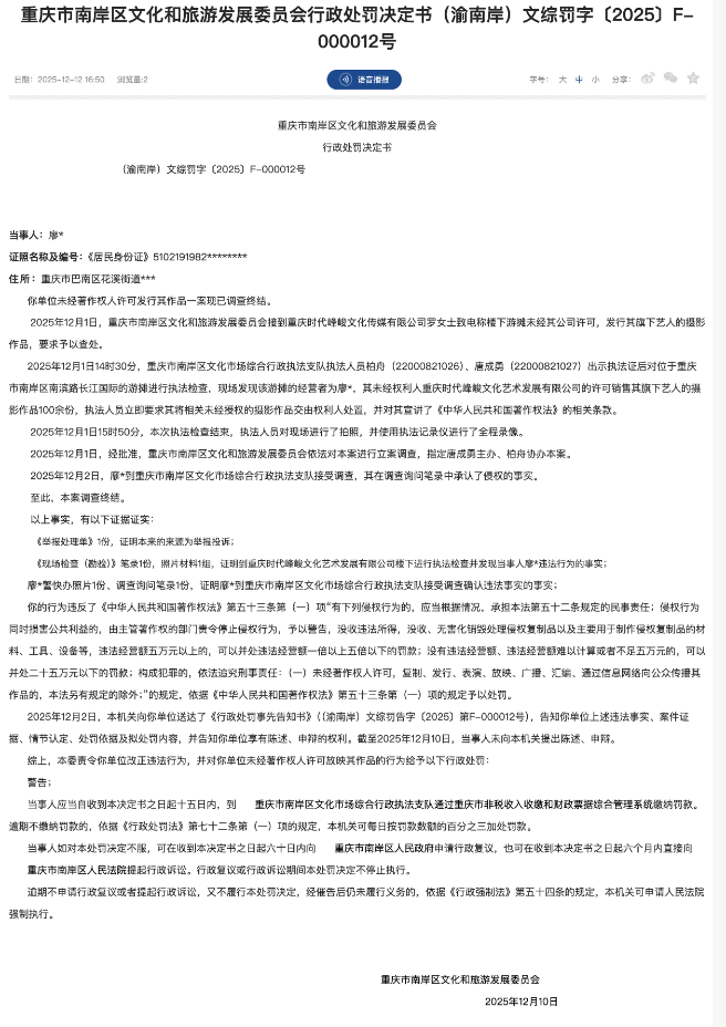 搜狐娛樂(lè)訊 據(jù)天眼查,近日,重慶市南岸區(qū)文化和旅游發(fā)展委員會(huì)對(duì)廖某作出警告的行政處罰。違法事實(shí)顯示,12月1日,重慶市南岸區(qū)文化和旅游發(fā)展委員會(huì)接到重慶時(shí)代峰峻文化傳媒有限公司羅女士致電稱樓下游攤未經(jīng)其公司許可,發(fā)行其旗下藝人的攝影作品,要求予以查處。 執(zhí)法人員在現(xiàn)場(chǎng)發(fā)現(xiàn)該游攤的經(jīng)營(yíng)者為廖某,其未經(jīng)權(quán)利人重慶時(shí)代峰峻文化藝術(shù)發(fā)展有限公司的許可銷售其旗下藝人的攝影作品100余份。12月2日,廖某到重慶市南岸區(qū)文化市場(chǎng)綜合行政執(zhí)法支隊(duì)接受調(diào)查,其在調(diào)查詢問(wèn)筆錄中承認(rèn)了侵權(quán)的事實(shí)。