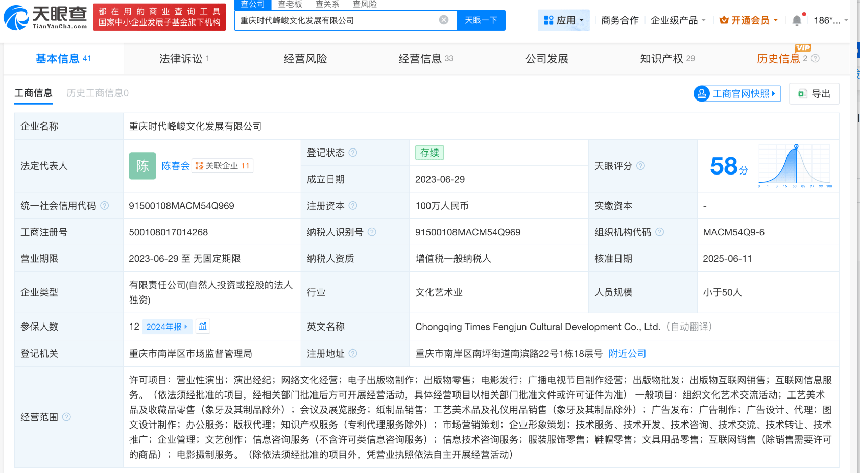 天眼查工商信息顯示,重慶時(shí)代峰峻文化藝術(shù)發(fā)展有限公司成立于2023年6月,法定代表人為陳春會(huì),注冊(cè)資本100萬(wàn)人民幣,經(jīng)營(yíng)范圍包括營(yíng)業(yè)性演出、演出經(jīng)紀(jì)、網(wǎng)絡(luò)文化經(jīng)營(yíng)等。