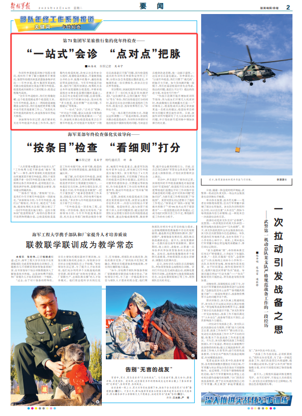 “一站式”會診,“點對點”把脈。“針對這個問題,建議從戰備方案和政治教育兩方面協同推進解決……”近日,該旅機關聯合檢查組赴某點位開展年終檢查,針對檢查中發現的“少數官兵戰備意識不強”問題,同為檢查組成員的作訓科李參謀和宣傳科王干事,分別從各自角度提出整改意見,并梳理形成一份反饋報告,供該點位官兵參考借鑒。