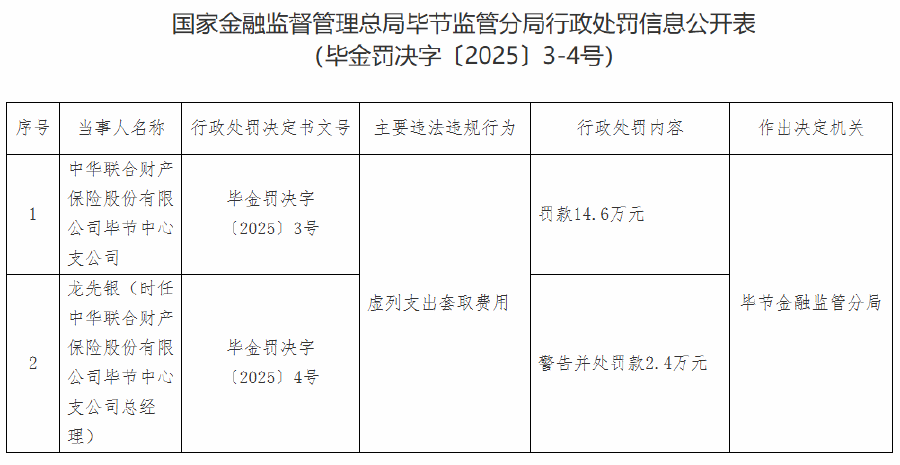 同時,畢節金融監管分局對時任中華聯合財產保險股份有限公司畢節中心支公司總經理龍先銀警告,并處罰款2.4萬元。