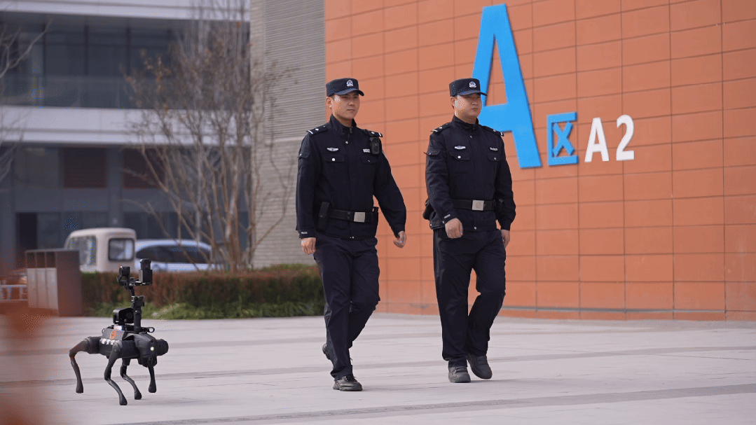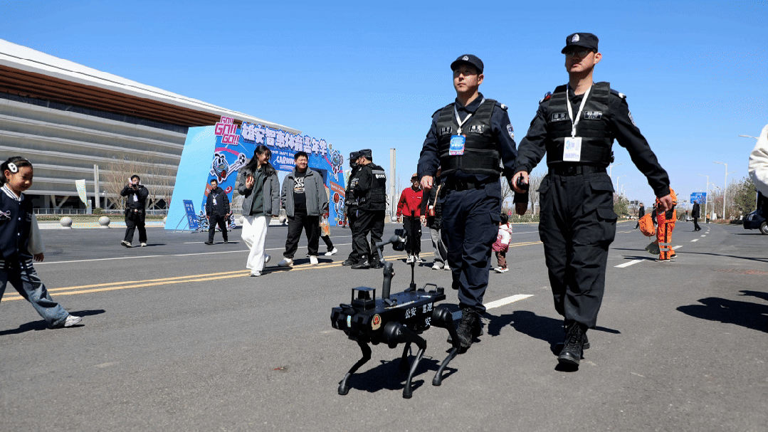 在新區(qū)首屆國際女籃邀請賽、雄安馬拉松、乒超聯(lián)賽等大型賽事活動現(xiàn)場,警用無人機在空中盤旋巡查,實時傳輸現(xiàn)場畫面,同時通過語音播報疏導(dǎo)人群。場館內(nèi)外,警用無人巡邏車與機器狗協(xié)同巡邏,巡邏車憑借智能化分析實時排查風(fēng)險隱患,機器狗則循著預(yù)設(shè)路線自主穿梭,自動伴隨巡邏,成為安保現(xiàn)場的“硬核力量”。